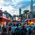 A grand cathedral with intricate architecture surrounded by a lively community scene featuring people participating in music, art, and local markets, highlighting the connection between spirituality and cultural values.